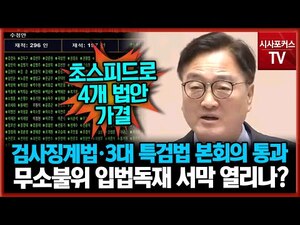 [ 포커스tv] 5일 국회 본회의에서 법무부 장관이 검사의 징계를 직접 청구할 수 있도록 하는 내용의 ‘검사징계법’ 개정안이 통과됐다.해당 개정안은 재석 의원 202명 중 찬성 185명, 반대 18명, 기권 1명으로 가결됐으며, 법무부 장관에게 징계청구권을 부여해 검찰에 대한 견제 기능을 강화하는 내용을 담고 있다.같은 날 더불어민주당이 추진해 온 이른바 '3대 특검법'도 국회 문턱을 넘었다. 채상병 사망 사건을 수사할 ‘채상병 특검법’, 2022년 3·9 대선을 둘러싼 공작 의혹을 다룰 ‘내란 음모 특검법’, 윤석열 대통령의 배우