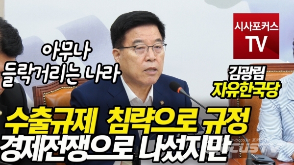자유한국당 최고위원회의 [포커스TV / 박상민 기자] 자유한국당 김광림 최고위원이 19일 열린 최고위원회의에서 일본의 경제침략 이후 50일간의 성적표는 참담하다고 말했다. 키워드 #김광림 #자유한국당 #한국당 #화이트리스트 #경제침략 #일본 #시사포커스 #시사포커스TV #시사 #포커스 #포커스TV 박상민 영상기자 ekdzhdtkd@naver.com 다른기사 보기 저작권자 © 포커스TV 무단전재 및 재배포 금지 당신만 안 본 뉴스 국민의힘 조배숙 "추미애, 나경원 두려워하는거 아닌가?" 국민의힘 조배숙 "추미애, 나경원 두려워하는거 아닌가?" 개의 댓글 회원로그인 작성자 비밀번호 댓글 내용입력 댓글 정렬 최신순 추천순 답글순 BEST댓글 BEST 댓글 답글과 추천수를 합산하여 자동으로 노출됩니다. 닫기 더보기 댓글삭제 삭제한 댓글은 다시 복구할 수 없습니다. 그래도 삭제하시겠습니까? 비밀번호 닫기 댓글수정 댓글 수정은 작성 후 1분내에만 가능합니다. 본문 / 400 비밀번호 닫기 내 댓글 모음 닫기 주요기사 국민의힘 조배숙 "추미애, 나경원 두려워하는거 아닌가?" 국민의힘 김문수 당대표 후보 긴급기자회견 개혁신당 이준석 대표 우원식 국회의장 예방 타인 질병까지 공격 소재로?...박선원 인신공격에 제대로 열받은 주진우 의문 목동 한강빌라 모르쇠?...국민의힘 곽규택 "후보자 지인이 배우자 전세금-인테리어 비용 내준거 아니냐?"...김민석 "내가 계약 주체 아니라 몰라" 민주당 김병기 원내대표·국민의힘 송언석 원내대표