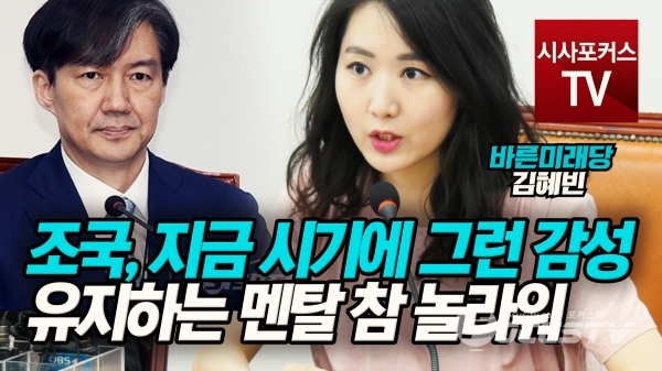 바른미래당 최고위원회의 [시사포커스 / 백대호 기자] 8월 21일 국회에서 진행된 바른미래당 최고위원회의에서 김혜빈 전국대학생위원장이 조국 법무부 장관 후보자에 대해 발언했다. 키워드 #김혜빈 #바른미래당 #조국 #용 #죽창 #멘탈 #청년 #특혜 #시사 #포커스 #시사포커스 #시사포커스tv 백대호 영상기자 eoghsla707@naver.com 다른기사 보기 저작권자 © 포커스TV 무단전재 및 재배포 금지 당신만 안 본 뉴스 국민의힘 조배숙 "추미애, 나경원 두려워하는거 아닌가?" 국민의힘 조배숙 "추미애, 나경원 두려워하는거 아닌가?" 개의 댓글 회원로그인 작성자 비밀번호 댓글 내용입력 댓글 정렬 최신순 추천순 답글순 BEST댓글 BEST 댓글 답글과 추천수를 합산하여 자동으로 노출됩니다. 닫기 더보기 댓글삭제 삭제한 댓글은 다시 복구할 수 없습니다. 그래도 삭제하시겠습니까? 비밀번호 닫기 댓글수정 댓글 수정은 작성 후 1분내에만 가능합니다. 본문 / 400 비밀번호 닫기 내 댓글 모음 닫기 주요기사 국민의힘 조배숙 "추미애, 나경원 두려워하는거 아닌가?" 국민의힘 김문수 당대표 후보 긴급기자회견 개혁신당 이준석 대표 우원식 국회의장 예방 타인 질병까지 공격 소재로?...박선원 인신공격에 제대로 열받은 주진우 의문 목동 한강빌라 모르쇠?...국민의힘 곽규택 "후보자 지인이 배우자 전세금-인테리어 비용 내준거 아니냐?"...김민석 "내가 계약 주체 아니라 몰라" 민주당 김병기 원내대표·국민의힘 송언석 원내대표
