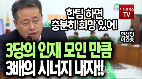 [포커스TV / 성유나 기자] 이관승 최고위원은 25일 민생당 최고위원회의에서 3당이 합당을 하다 보니 잠시 소란이 있었지만, 한 팀으로 맞추면서 충분히 희망이 있고, 3당의 인재 모인 만큼 3배의 시너지를 낼 수 있다고 말했다.