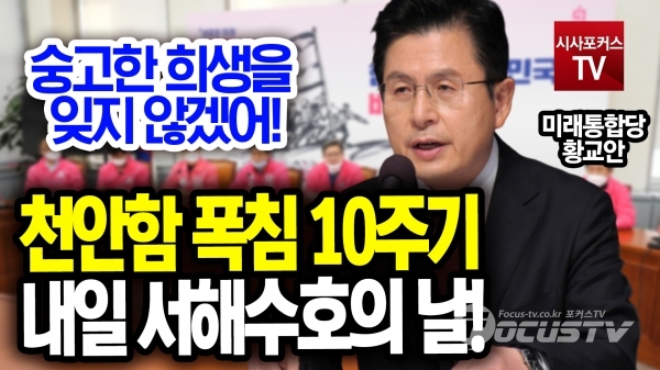 [포커스tv/성유나 기자]황교안 총괄선대위원장은 26일 미래통합당 중앙선거대책위원회 회의에서 오늘은 천안함 폭침 10주기가 되는 날이고, 내일은 서해수호의 날이고, 우리 젊은 장병들의 안보를 위한 숭고한 희생을 잊지 않겠다고 말했다.