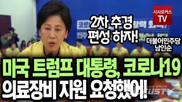 [포커스tv/성유나 기자] 남인순 부위원장은 26일 더불어민주당 코로나19국난극복위원회에서 미국 트럼프 대통령은 코로나19 의료장비 지원 요쳥을 했고, 2차 추경 편성을 하자고 말했다.