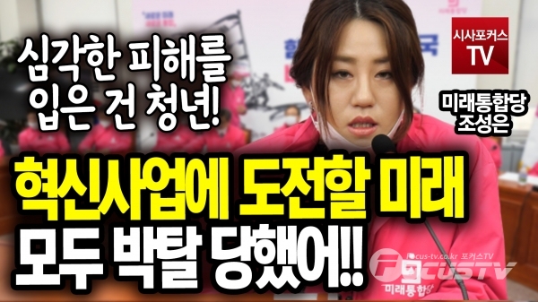 [포커스tv/성유나 기자]조성은 부위원장은 31일 미래통합당 선거전략대책회의에서 가장 심각한 피해를 입은 건 청년이며, 혁신사업에 도전할 미래도 모두 박탕 당하고 있다고 말했다.