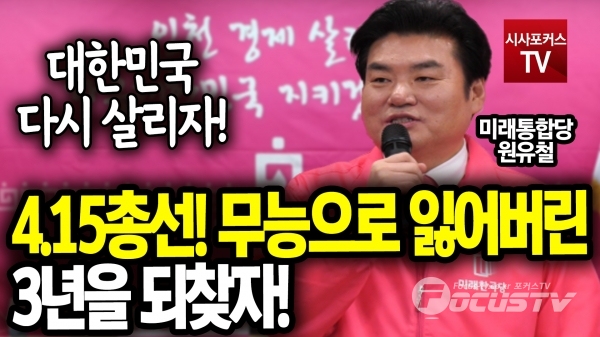 [포커스tv/성유나 기자] 미래한국당 원유철 당대표는3일 미래통합당 인천 현장 선거대책위원회 회의에서 4.15총선때 무능으로 잃어버린 3년을 되찾고 대한민국을 다시 살리자고 말했다.