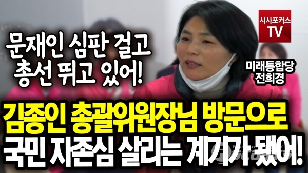[포커스tv/성유나 기자] 전희경 후보자는 3일 김종인 총괄선대위원장 인천 중구 강화울진/동구 미추홀구 후보지원에서 김종인 위원장님 방문으로 인천지역의 국민 자존심을 살리는 계기가 됐고, 문재인 심판을 걸고 총선을 뛰고 있다고 말했다.