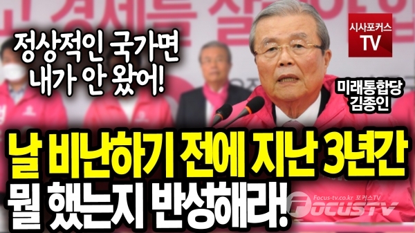 [포커스tv/성유나 기자] 김종인 총괄선대위원장은 5일 대전 권역 선거대책위원회 회의에서 민주당에게 날 비난하기 전에 지난 3년간 뭘 했는지 반성하고 정상적인 국가였으면 내가 안 왔다고 말했다.