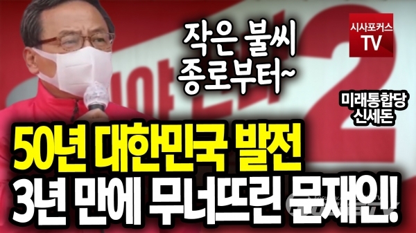 [포커스tv/성유나 기자] 신세돈 선대위원장은 6일 서울 종로 후보 지원 유세에서 50년 대한민국의 발전을 3년 만에 무너뜨린 문재인이고 작은 불씨를 종로부터 시작해서 전국으로 퍼지게 하자고 말했다.