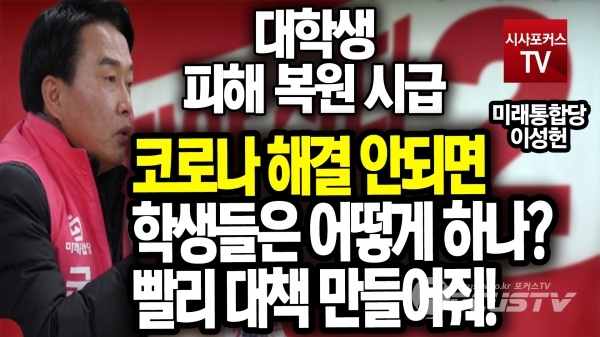 [포커스tv/성유나 기자] 이성헌 후보자는 6일 미래통합당 서울 현장 선대위 회의에서 코로나 해결이 안되면 학생들은 어떻게 하고, 빨리 대책을 만들어주고 대학생 피해 복원이 시급하다고 말했다.
