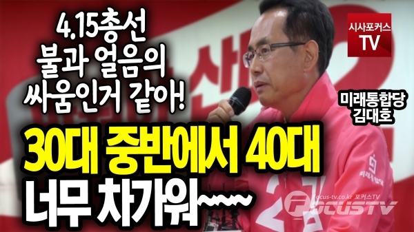 [포커스tv/성유나 기자] 김대호 후보자는 6일 미래통합당 서울 현장 선대위 회의에서 30대 중반에서 40대 사람들이 너무 차갑고 4.15총선은 불과 얼음의 싸움인거 같다고 말했다.