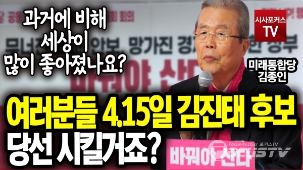 [포커스tv/성유나 기자] 김종인 총괄선대위원장은 7일 강원도 춘천 철원 화천 양구 후보 지원 유세에서 국민 여러분들 4.15총선때 김진태 후보 당선 시킬건지 물었고, 과거에 비해 세상이 많이 좋아졌는지 물었다.