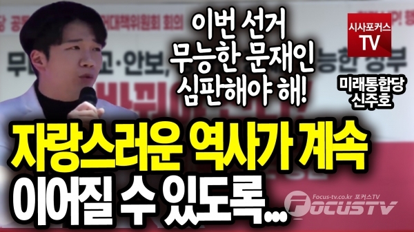 [포커스tv/성유나 기자] 신주호 청년대변인은 8일 경기도 시흥시 후보 지원 유세에서 대한민국의 자랑스러운 역사가 계속 이어질 수 있도록 투표를 해주시고, 이번 선거는 무능한 문재인을 심판해야 한다고 말했다.