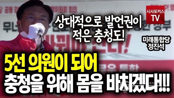 [포커스tv/성유나 기자] 정진석 후보자는 8일 충청남도 공주 청양 부여 후보 지원 유세에서 상대적으로 발언권이 적은 충청도고 5선 의원이 되어서 충청을 위해 몸은 바치겠다고 말했다.