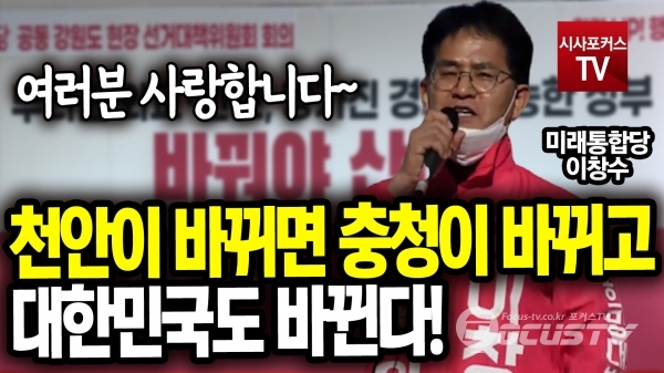 [포커스tv/성유나 기자] 이창수 후보자는 8일 충청남도 천안 후보 지원 유세에서 천안이 바뀌면 충청이 바뀌고 대한민국도 바뀐다고 말했다.