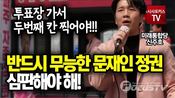 [포커스tv/성유나 기자] 미래통합당의 신주호씨가 경기도 파주 경기도 후보 지원 유세에서 반드시 무능한 문재인 정권을 심판해야 한다고 말하며 투표장에 가서 두번째 칸에 찍어야 한다고 말했다.