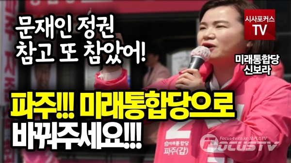 [포커스tv/성유나 기자] 미래통합당 신보라 후보가 문재인 정권에 대해 참고 또 참았다며 파주를 미래통합당으로 바꿔달라고 호소했다.