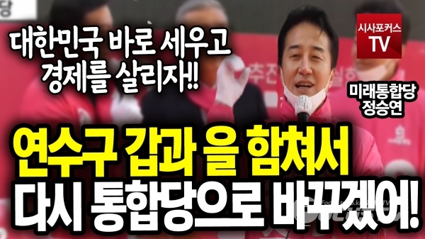 [포커스tv/성유나 기자] 미래통합당 정승연 후보가 11일 선거유세에서 연수구 갑과 을을 합쳐서 다시 통합당으로 바꾸겠다고 말했다.미래통합당 정승연 후보가 11일 선거유세에서 연수구 갑과 을을 합쳐서 다시 통합당으로 바꾸겠다고 말했다.