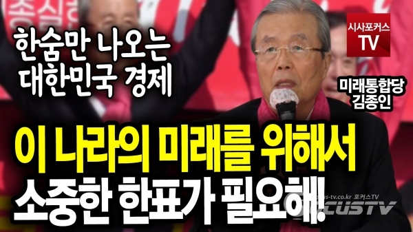 [포커스tv/성유나 기자] 김종인 총괄선대위원장은 13일 세종시 (을) 후보 지원 유세에서 이 나라의 미래를 위해서 소중한 한표가 필요하고 한숨만 나오는 대한민국 경제라고 말했다.