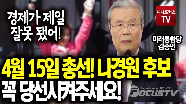 [포커스tv/성유나 기자] 김종인 총괄선대위원장은 14일 서울 동작을 후보지원 유세에서 4월 15일 총선에서 나경원 후보를 꼭 당선시켜주시고, 경제가 제일 잘못 됐다고 말했다.