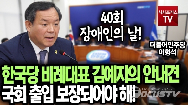 [포커스tv/성유나 기자] 이형석 최고위원은 20일 더불어민주당 최고위원회 회의에서 한국당 비례대표 김예지의 안내견 조이는 국회 출입이 보장 되어야하고 오늘은 40회 장애인의 날이라고 말했다.