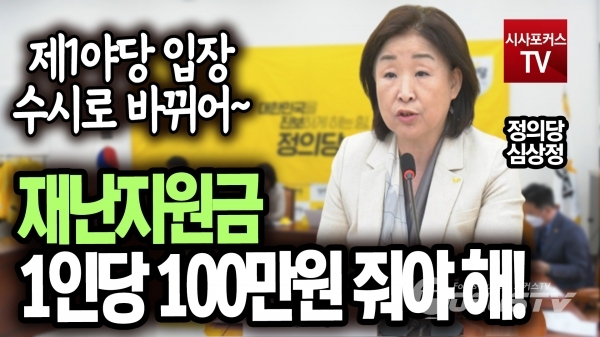 [포커스tv/성유나 기자] 심상정 당대표는 20일 정의당 상무위원회의에서 제1야당의 입장이 수시로 바뀌고, 재난지원금은 1인당 100만원을 줘야 한다고 말했다.