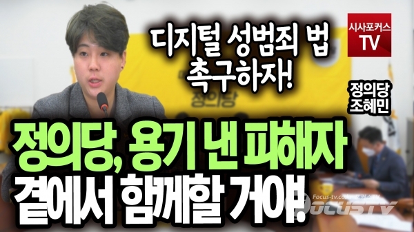 [포커스tv/성유나 기자] 조혜민 여성본부장은 20일 정의당 상무위원회의에서 정의당은 용기 낸 피해자 곁에서 함께할 것이고, 디지털 성범죄 법을 촉구해야한다고 말했다.
