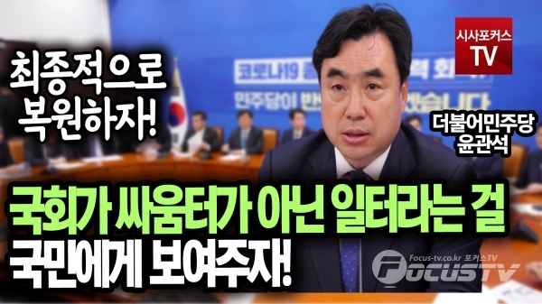 [포커스tv/성유나 기자] 윤관석 의원은 21일 더불어민주당 원내대표단-상임위간사단 연석회의에서 국회가 싸움터가 아닌 일터라는걸 국민에게 보여주고 21대 국회에 물려주기 전에 최종적으로 복원하자고 말했다.
