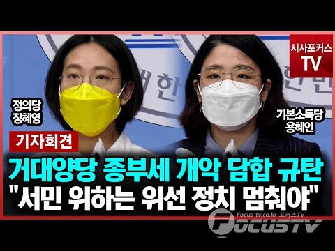 [포커스TV / 권민구 기자] 기본소득당 용혜인 의원과 정의당 정혜영 의원이 21년 7월 13일 국회 소통관 기자회견장에서 거대 정당들의 종부세 개악 담합 규탄 기자회견을 하고 있다.